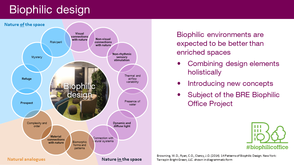 Biophilic design has many definitions. Terrapin, for example, propose a number of characteristics that make up biophilic design in three broad categories, as we can see here.