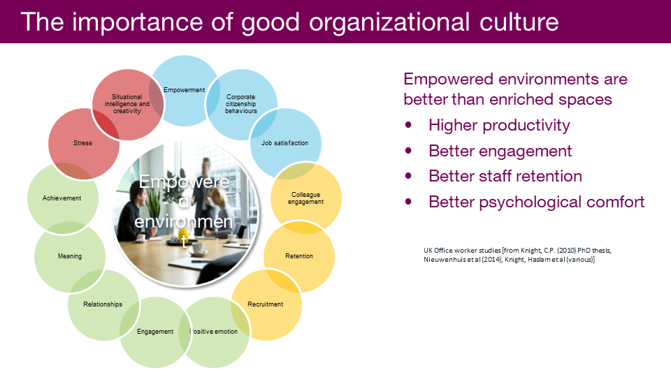 Craig Knight’s research, and that of others, has shown that the biggest impact on performance and wellbeing isn’t plants, art, smells, and everything else that we do, but it is organizational culture.