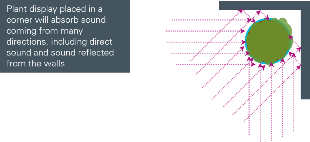 Plants alter room acoustics by reducing the reverberation time. Plants work better in acoustically live spaces, such as those that have hard surfaces like marble walls, exposed concrete and stone floors.