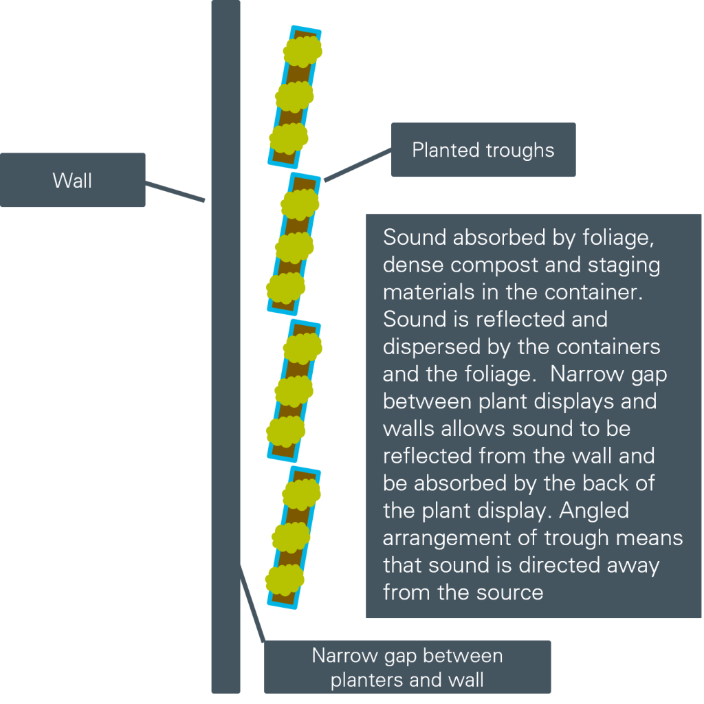 Looking again at the video, the key point is that by introducing shapes that disrupt the path of soundwaves as well as absorbing them, is a very effective way of reducing noise. This is where plants can make a useful (and very cost-effective) impact.