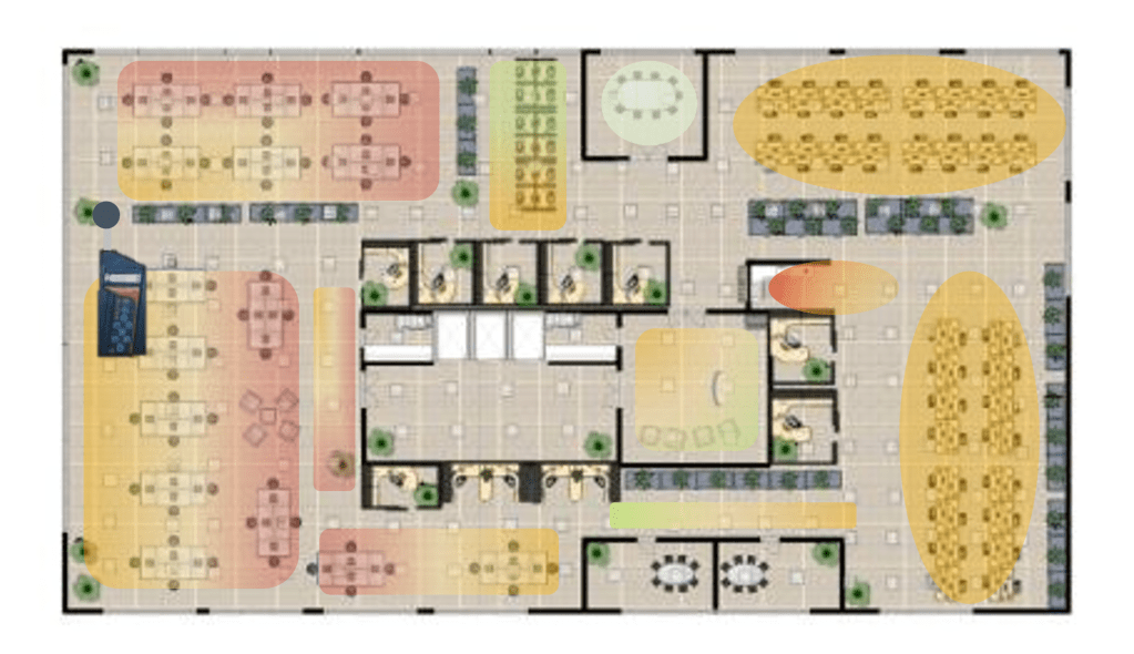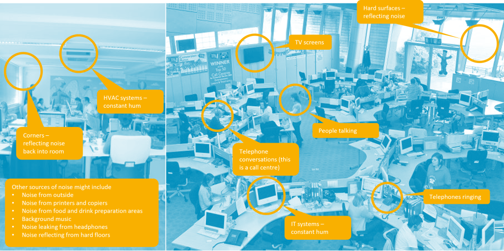 As discussed earlier, noise levels in a large space are often not uniform. There are multiple noise sources, and the sound from any particular noise source can be magnified or focused some way from its origin due to the layout of the space. Sound might be reflected in one direction and blocked from going elsewhere. A distracting noise might be perceived some distance from its source. Sometimes the only way to be sure of where noise is coming from is to take some objective measurements with a noise meter and map where the noise ‘hotspots’ are found.